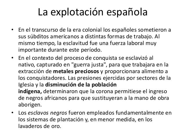 - La explotación española En el transcurso de la era colonial los españoles sometieron a sus súbditos americanos a distintas formas de trabajo. Al mismo tiempo, la esclavitud fue una fuerza laboral muy importante durante este período.• En el contexto del proceso de conquista se esclavizó al nativo, capturado en "guerra justa", para que trabajara en la extracción de metales preciosos y proporcionara alimento a los conquistadores. Las presiones ejercidas por sectores de la Iglesia y la disminución de la población indígena, determinaron que la corona permitiese el ingreso de negros africanos para que sustituyeran a la mano de obra aborigen.• Los esclavos negros fueron empleados fundamentalmente en los siste